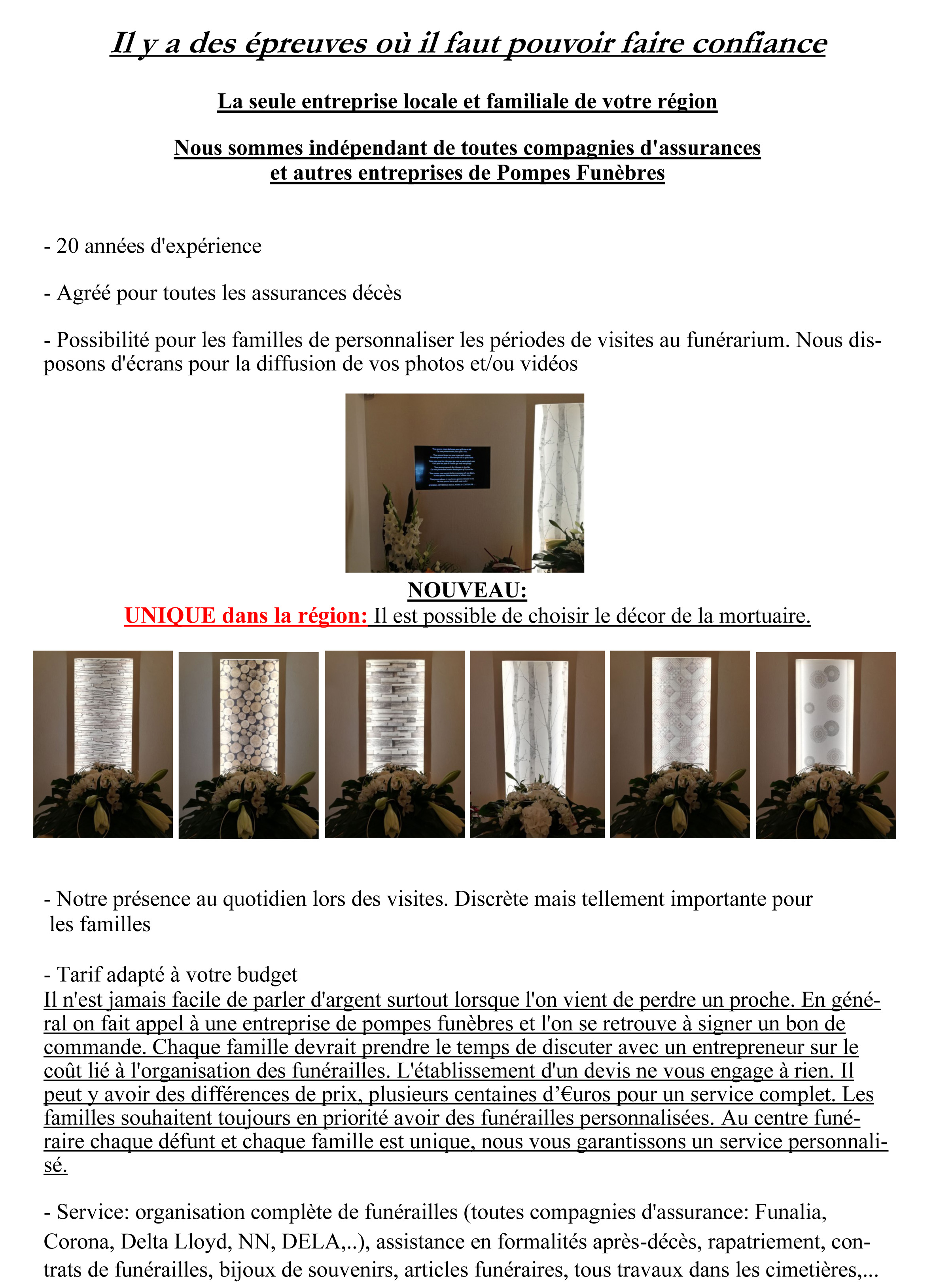 A l'heure de la mondialisation qui touche aussi le secteur des Pompes Funèbres il devient important de pouvoir faire confiance à une petite entreprise familiale avec des valeurs proches de la population. Lorsque vous êtes confronté au décès d'un proche tout s'enchaine très vite et vous vous retrouvez à signer un bon de commande sans avoir pu faire une comparaison entre différentes entreprises de Pompes Funèbres.