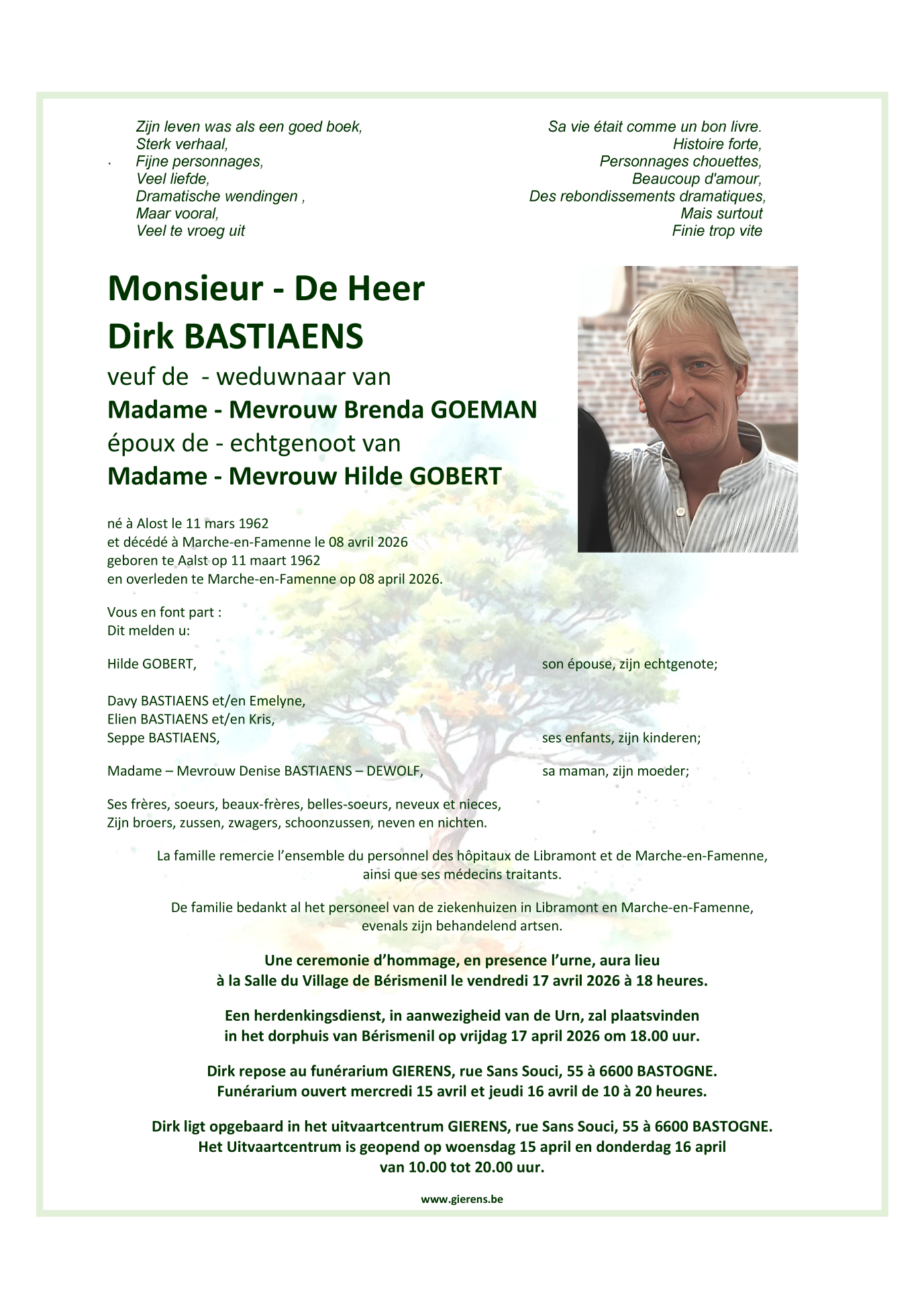 Avis de décès de Monsieur Dirk BASTIAENS