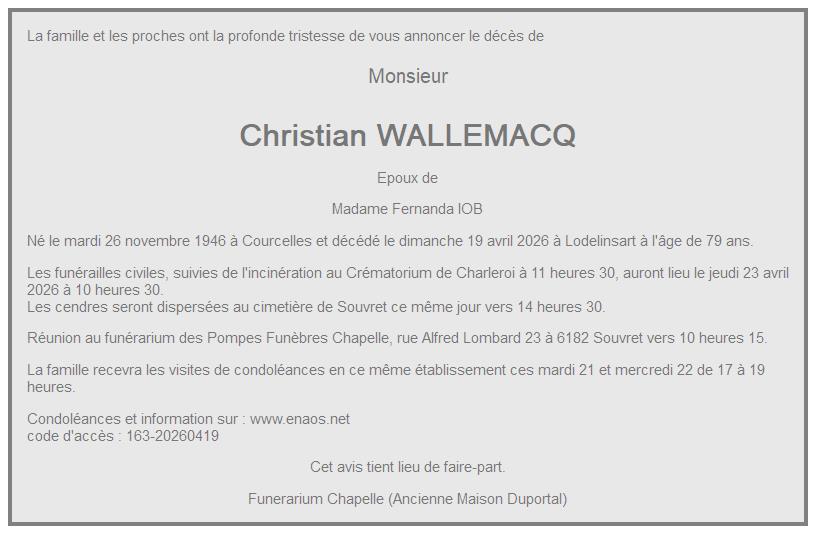 Crématorium de Charleroi le jeudi 23 avril à 11 heures 30