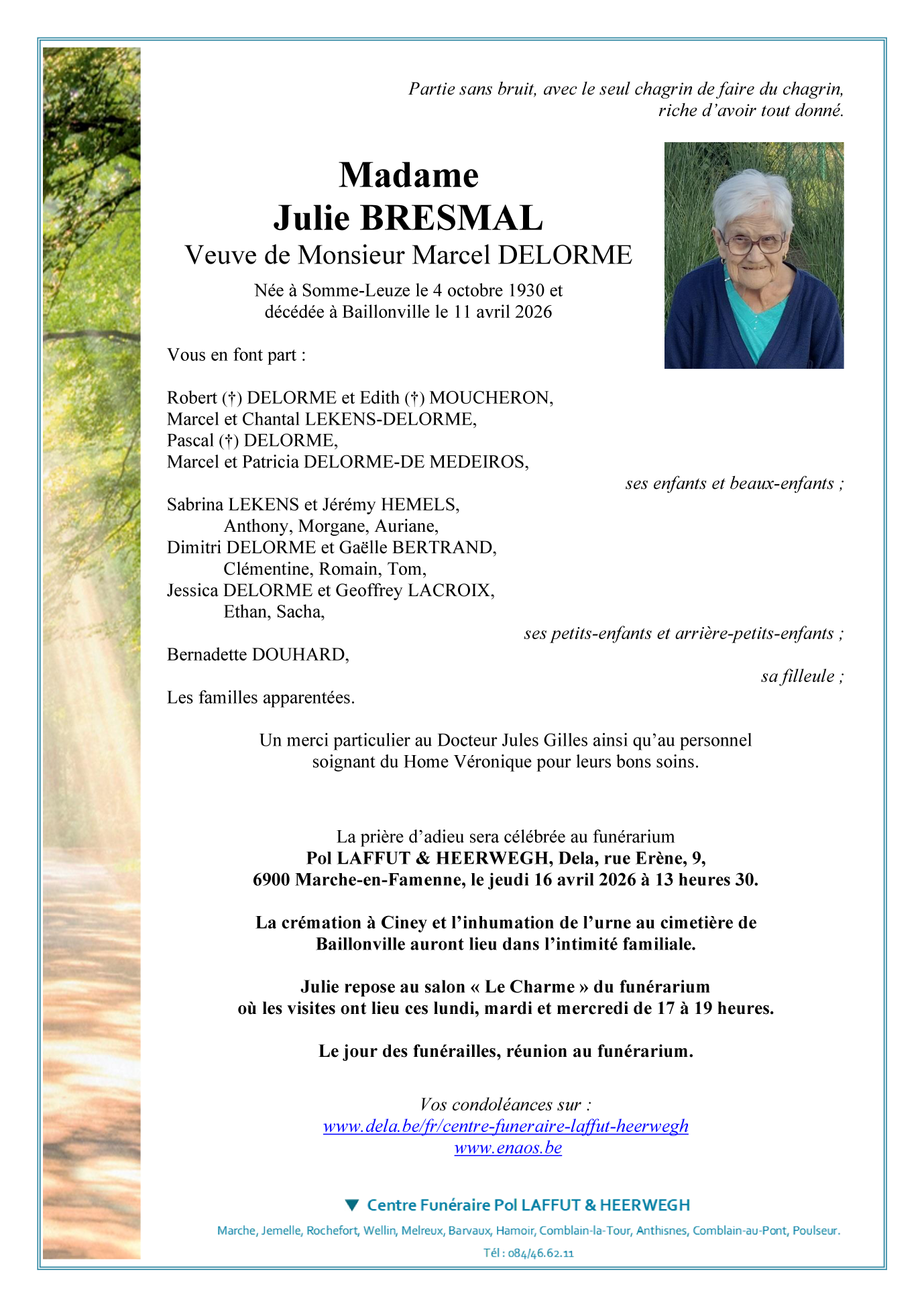 Avis de décès de Madame Julie BRESMAL