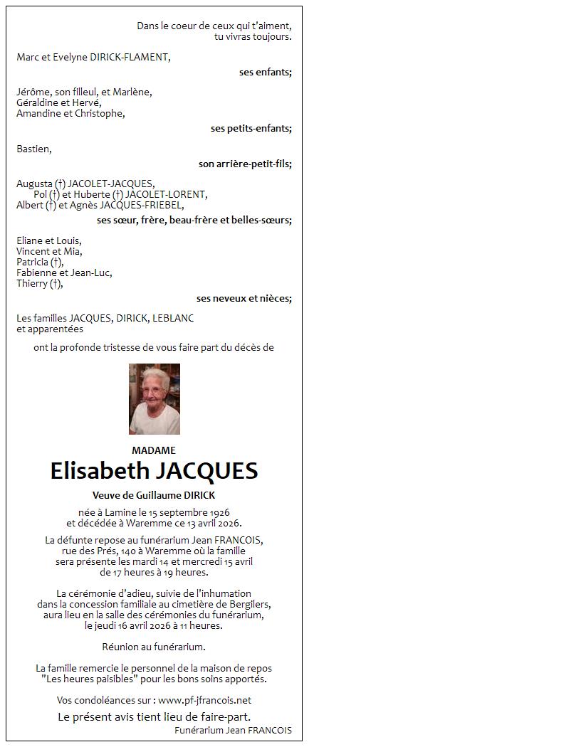 Funérarium Jean FRANCOIS de Waremme demain, jeudi 16 avril à 11 heures