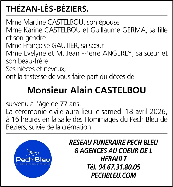 CENTRE FUNERAIRE DE BEZIERS le samedi 18 avril à 16 heures 45
