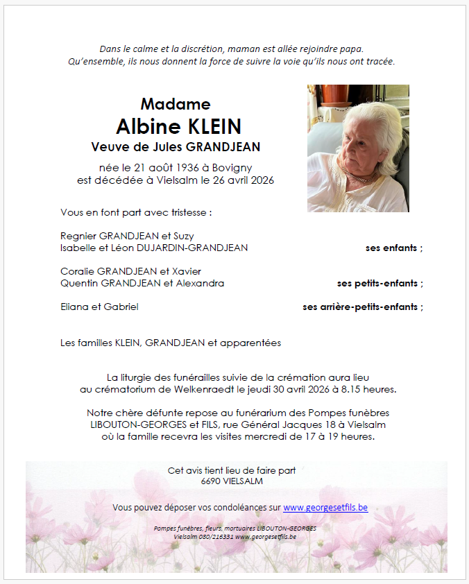 Avis de décès de Madame Albine KLEIN