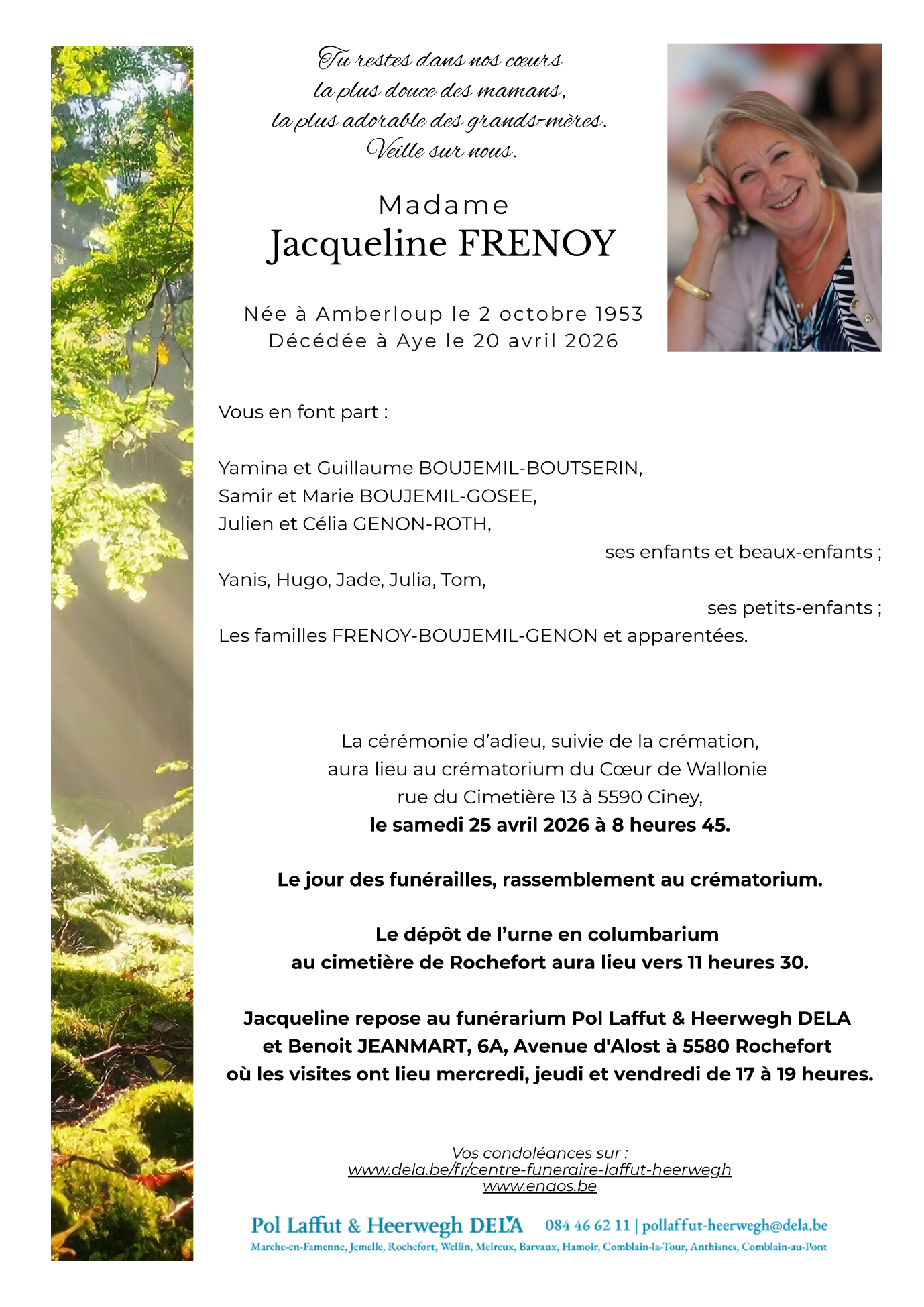 crématorium du Coeur de Wallonie le samedi 25 avril à 8 heures 45