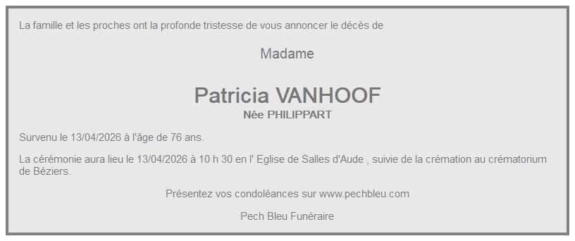 Avis de décès de Madame Patricia VANHOOF née PHILIPPART
