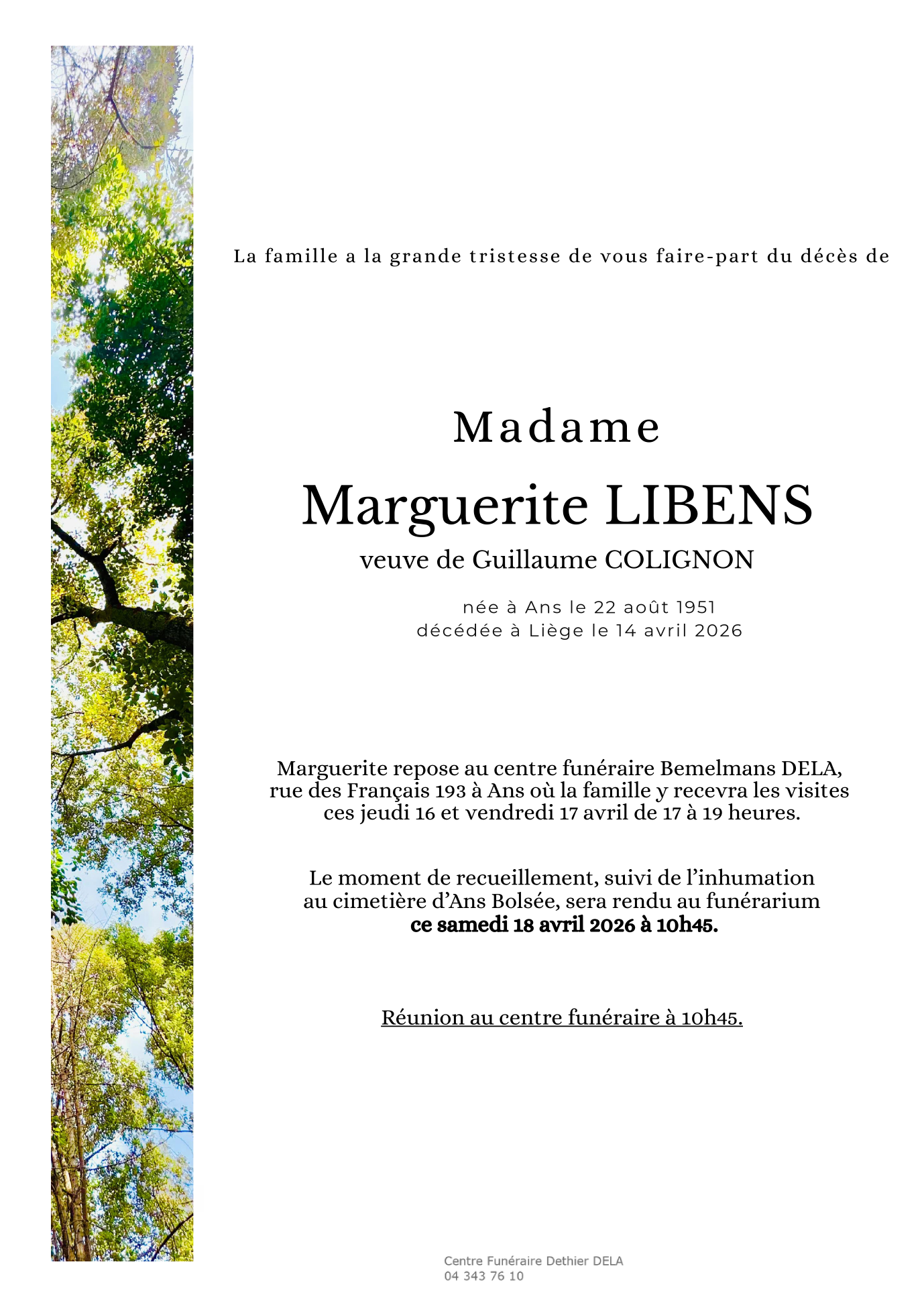 au funérarium te Ans op zaterdag 18 april om 10 u 45