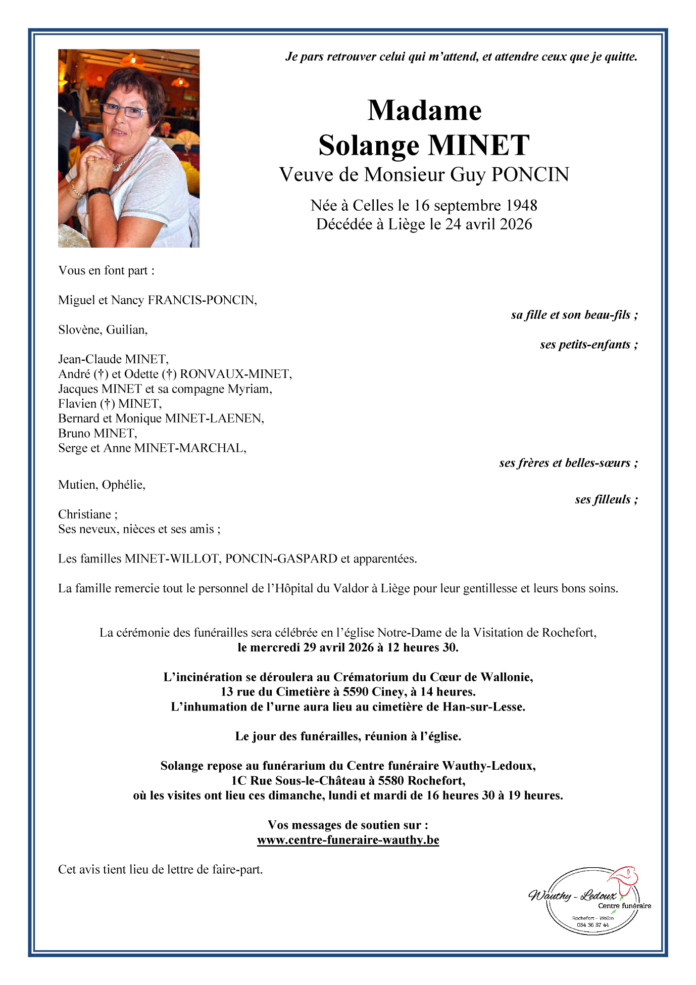crématorium du Coeur de Wallonie le mercredi 29 avril à 14 heures