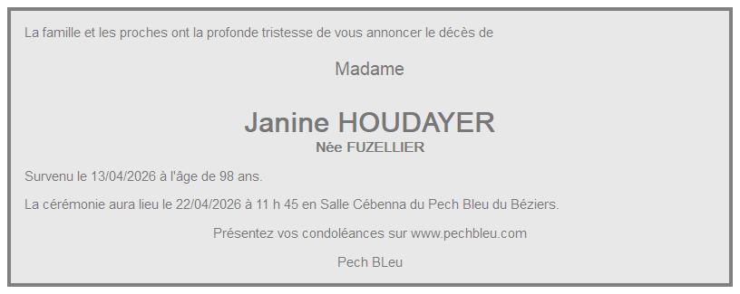 Avis de décès de Madame Janine HOUDAYER née FUZELLIER