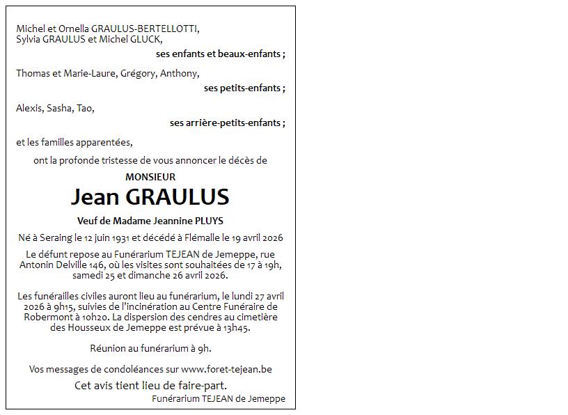 Funérarium TEJEAN de Jemeppe de Jemeppe-sur-Meuse le lundi 27 avril à 9 heures 15