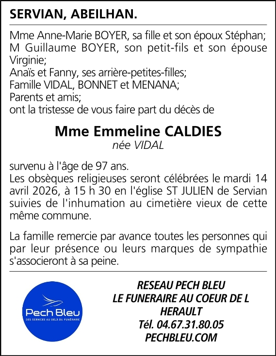 Avis de décès de Madame Emmeline CALDIES née VIDAL