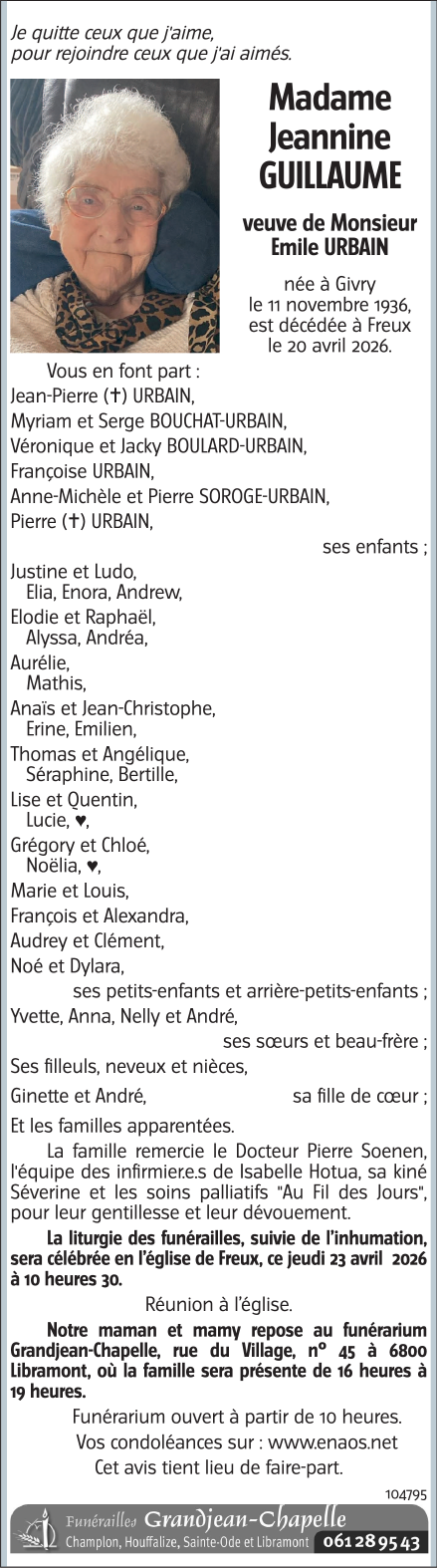 Décédée à Freux (6800) le lundi 20 avril 2026 à l'âge de 89 ans