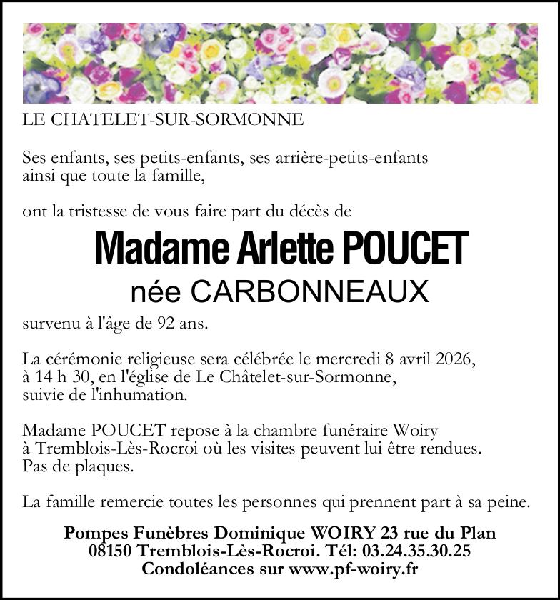 Overlijdensbericht van Mevrouw Arlette POUCET geboren CARBONNEAUX