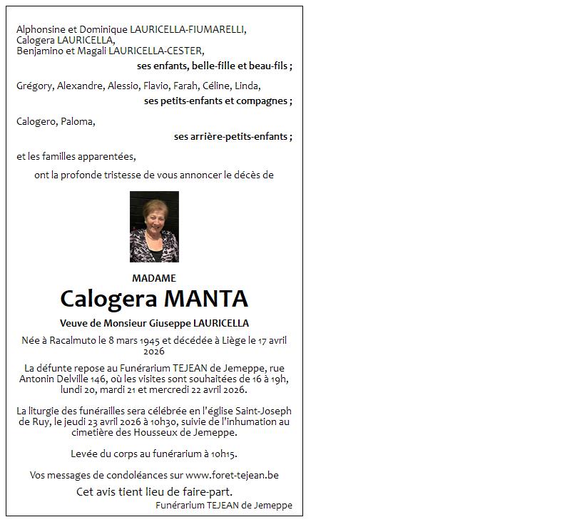 Décédée à Liège (4000) le vendredi 17 avril 2026 à l'âge de 81 ans