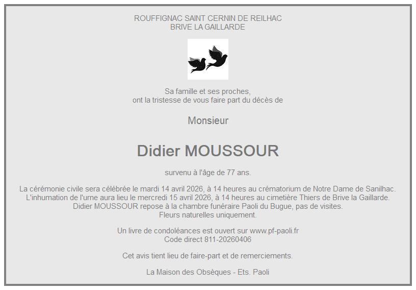 Avis de décès de Monsieur Didier MOUSSOUR