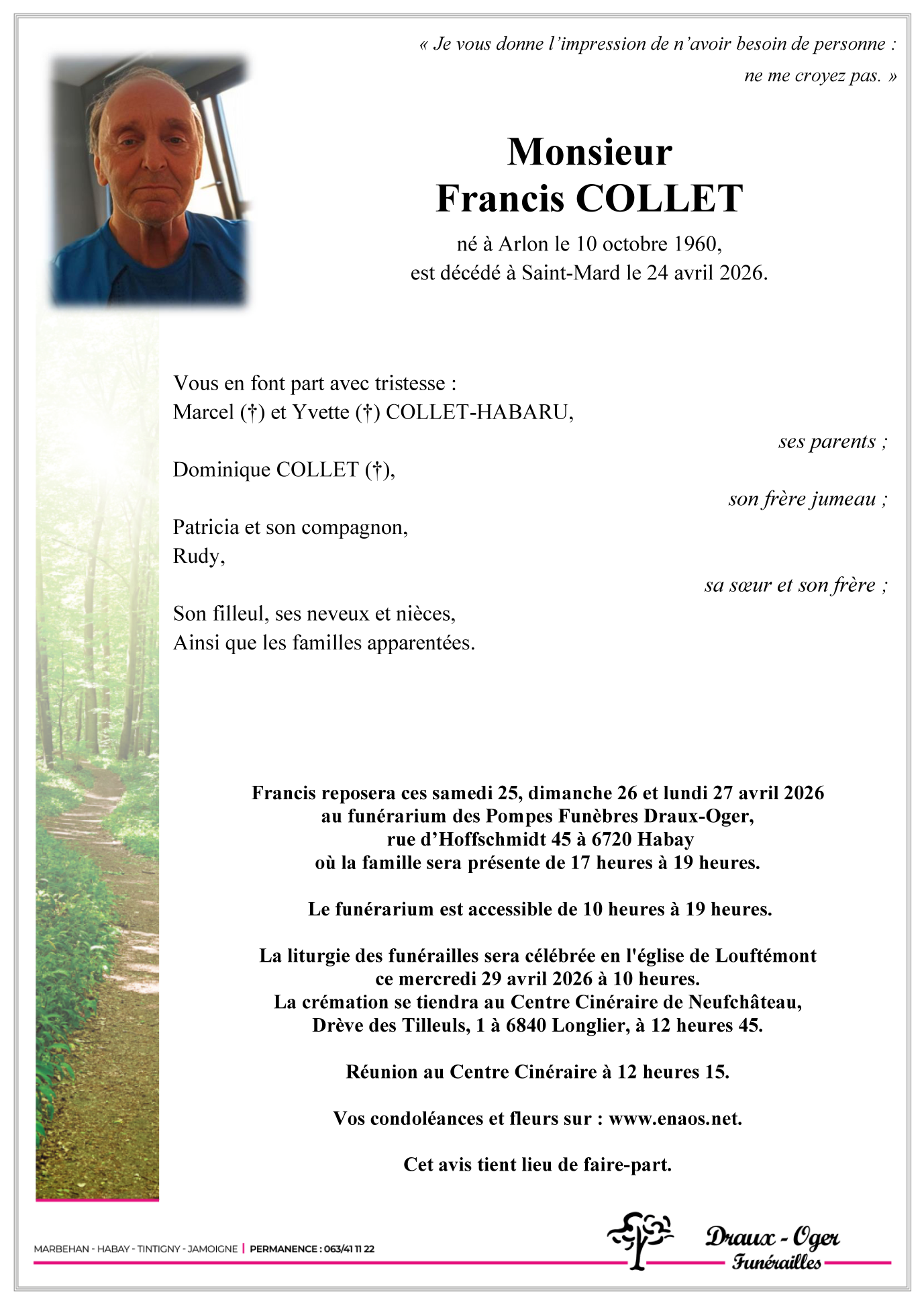 Centre cinéraire de Longlier (Neufchâteau) le mercredi 29 avril à 12 heures 45