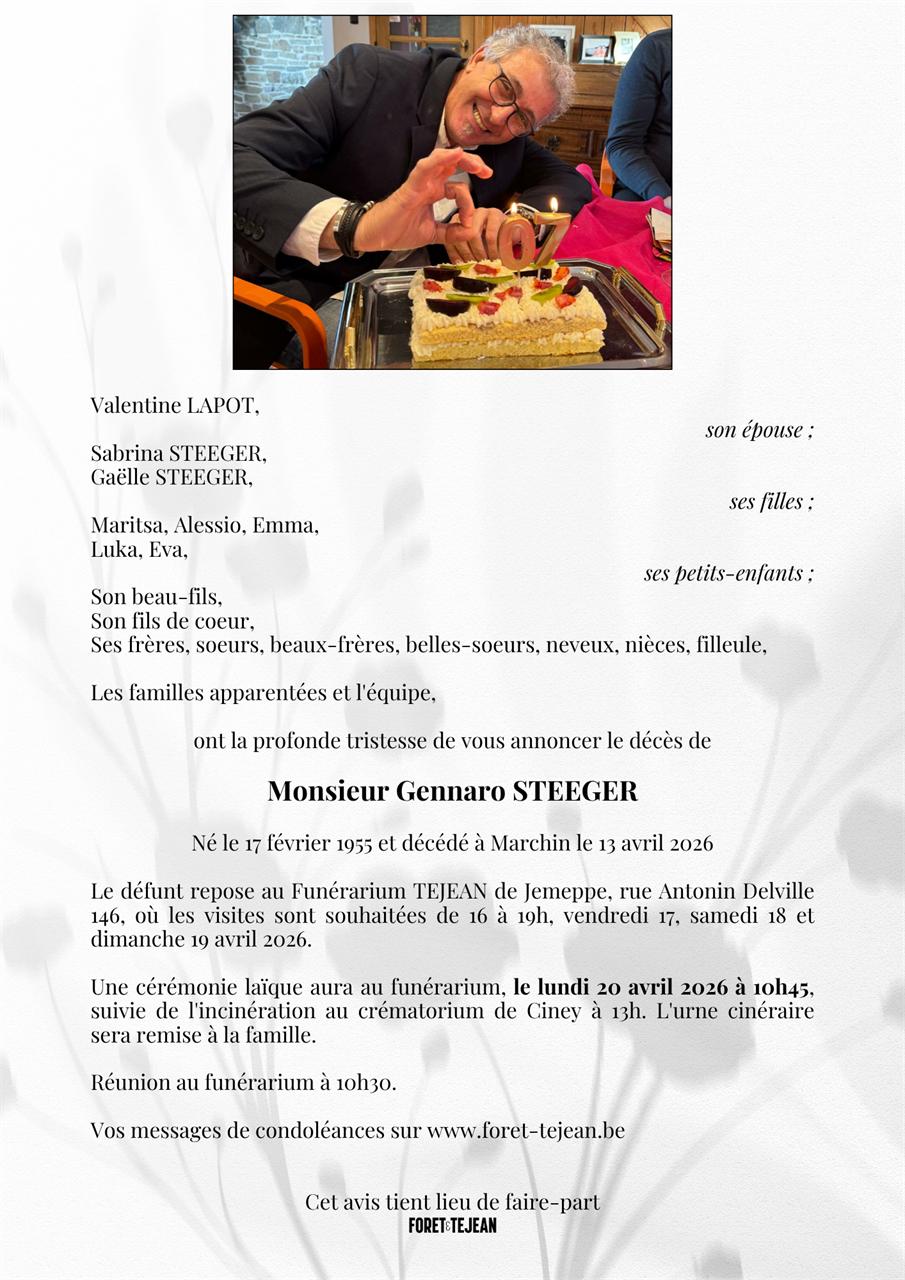 Funérarium TEJEAN de Jemeppe de Jemeppe-sur-Meuse le lundi 20 avril à 10 heures 45