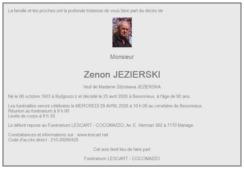 Funérarium LESCART - COCOMAZZO de Manage demain, mercredi 29 avril à 9 heures 30