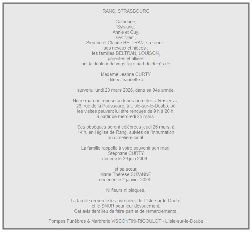 Avis de décès de Madame Jeanne CURTY née BÉCHIRE
