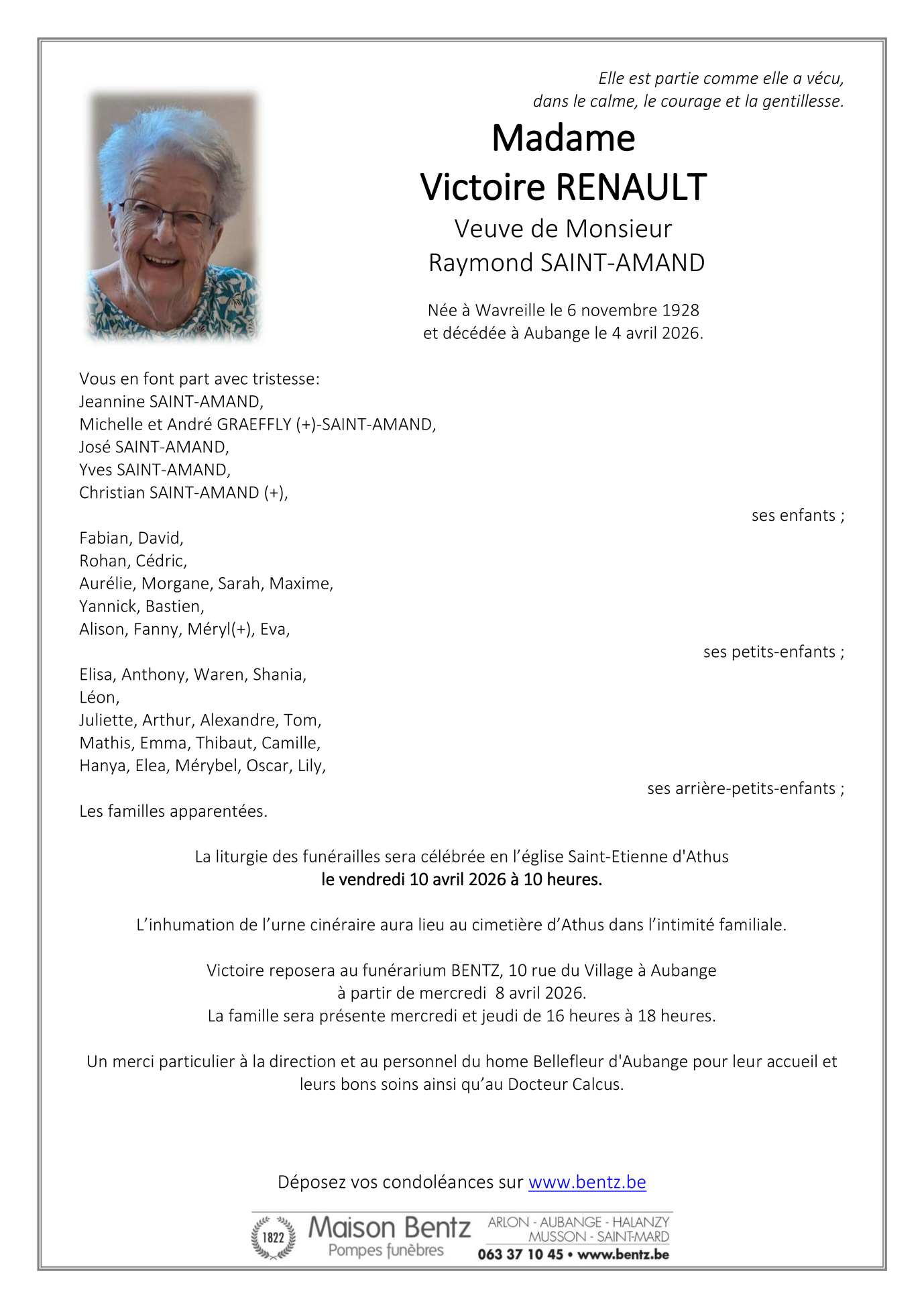 Avis de décès de Madame Victoire RENAULT