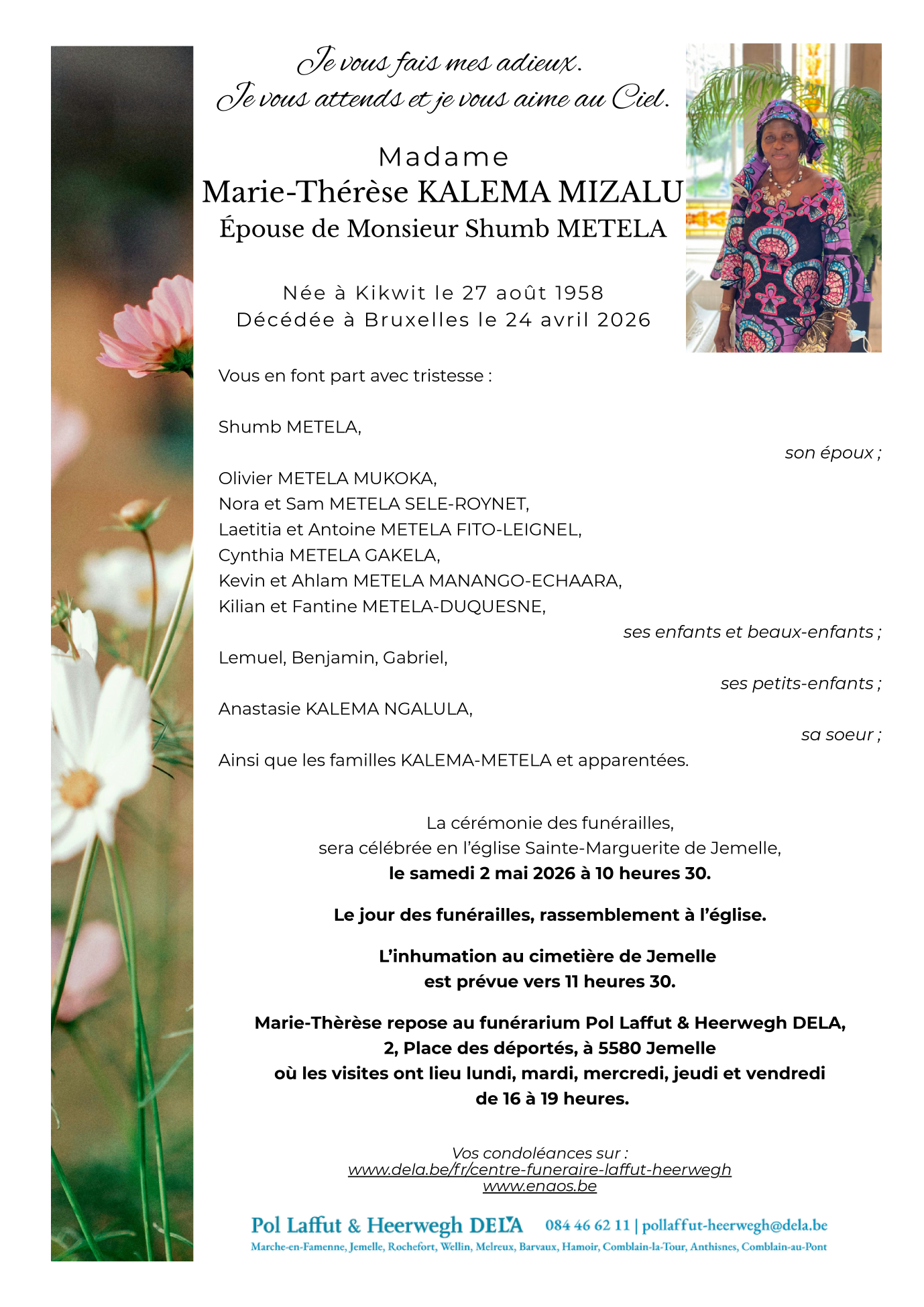 Avis de décès de Madame Marie-Thérèse KALEMA MIZALU