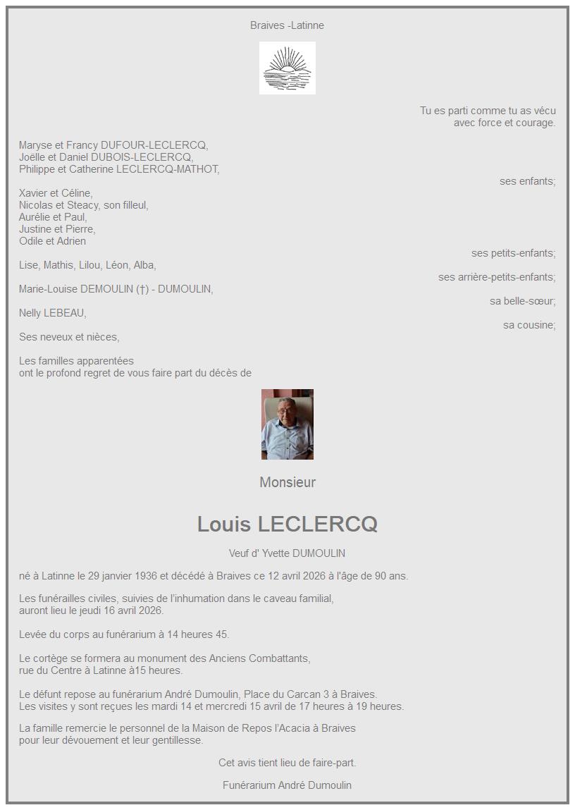 Avis de décès de Monsieur Louis LECLERCQ