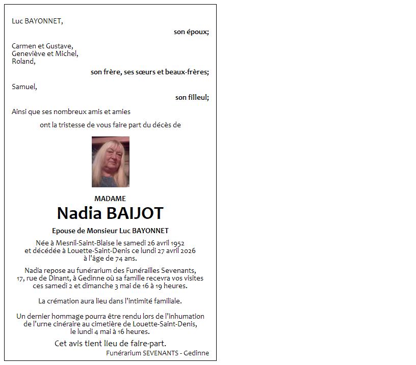 Avis de décès de Madame Nadia BAIJOT