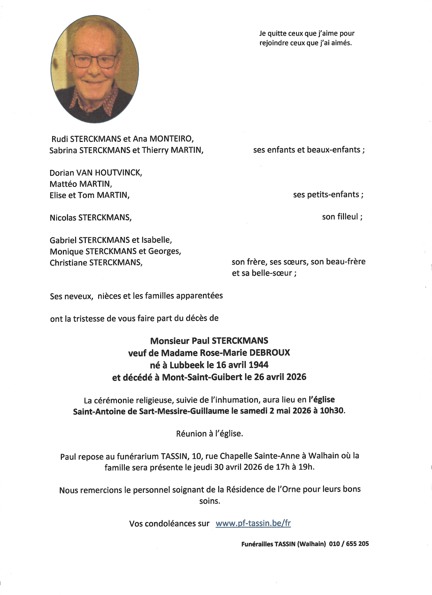 Décédé à Mont-Saint-Guibert (1435) le dimanche 26 avril 2026 à l'âge de 82 ans