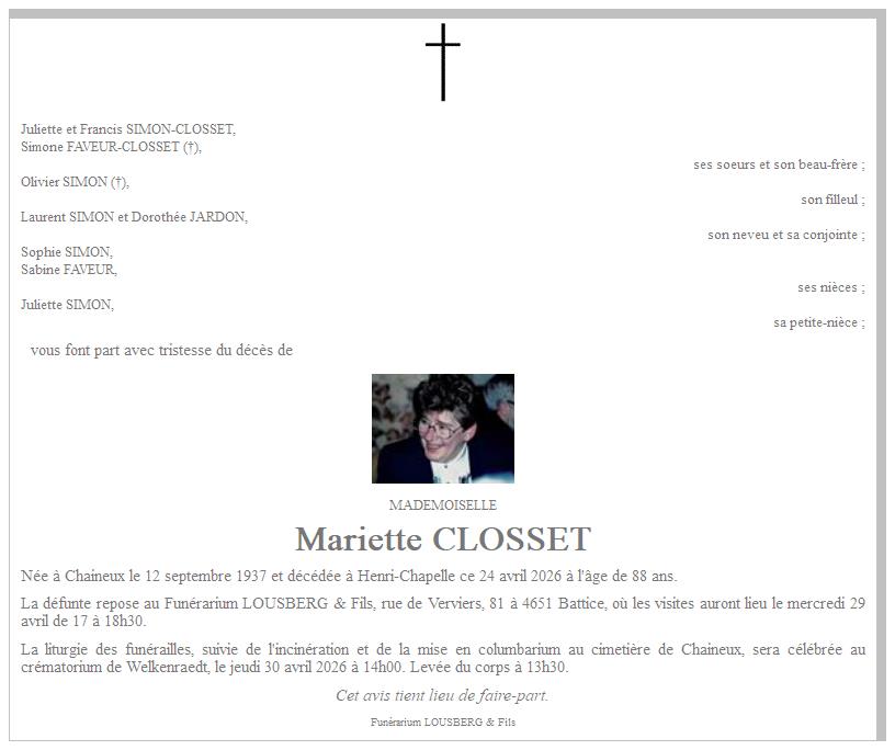 Avis de décès de Mademoiselle Mariette CLOSSET