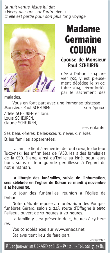 Décédée à Dohan (6836) le vendredi 31 octobre 2014 à l'âge de 87 ans