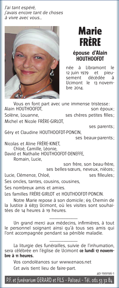 Décédée à Ucimont (6833) le jeudi 13 novembre 2014 à l'âge de 35 ans