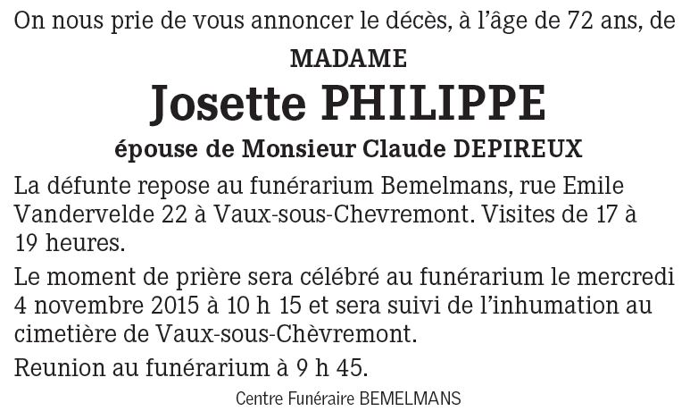 Décédée à Liège (4000) le samedi 31 octobre 2015 à l'âge de 72 ans