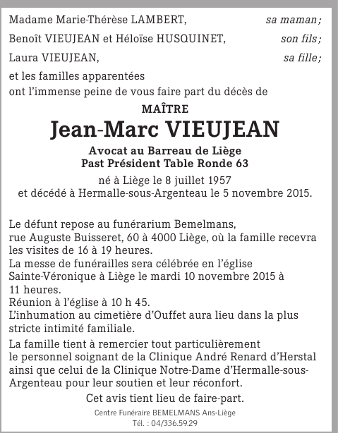 Fallecido en Hermalle-sous-Argenteau (4681) el jueves, 5 de noviembre de 2015 a la edad de 58 años