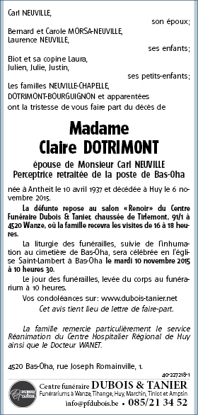 Décédée à Huy (4500) le vendredi 6 novembre 2015 à l'âge de 78 ans