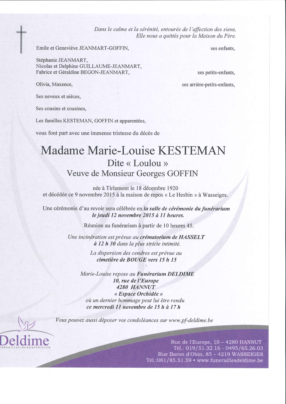 Décédée à Wasseiges (4219) le lundi 9 novembre 2015 à l'âge de 94 ans
