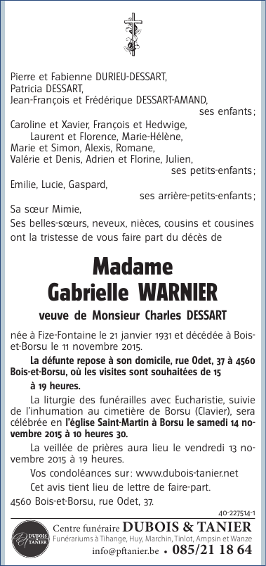 Décédée à Bois-et-Borsu (4560) le mercredi 11 novembre 2015 à l'âge de 84 ans