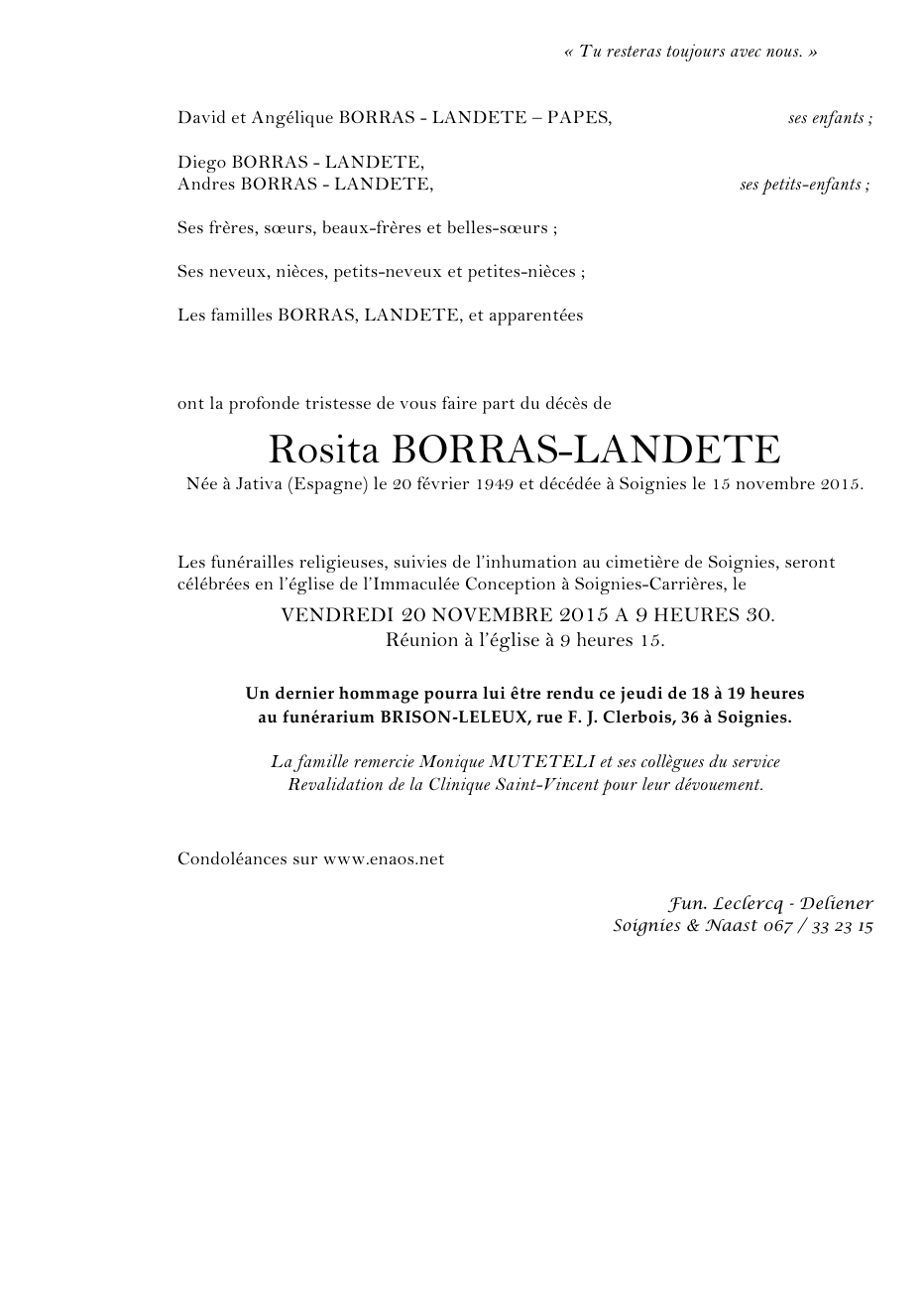 Décédée à Soignies (7060) le dimanche 15 novembre 2015 à l'âge de 66 ans