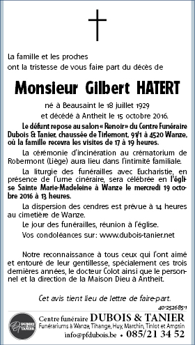 Décédé à Antheit (4520) le samedi 15 octobre 2016 à l'âge de 87 ans