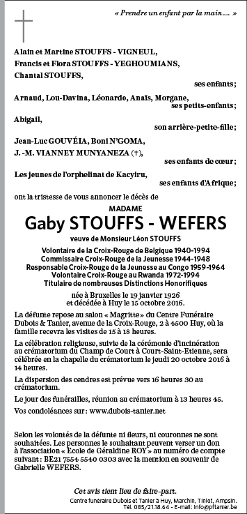 Décédée à Huy (4500) le samedi 15 octobre 2016 à l'âge de 90 ans
