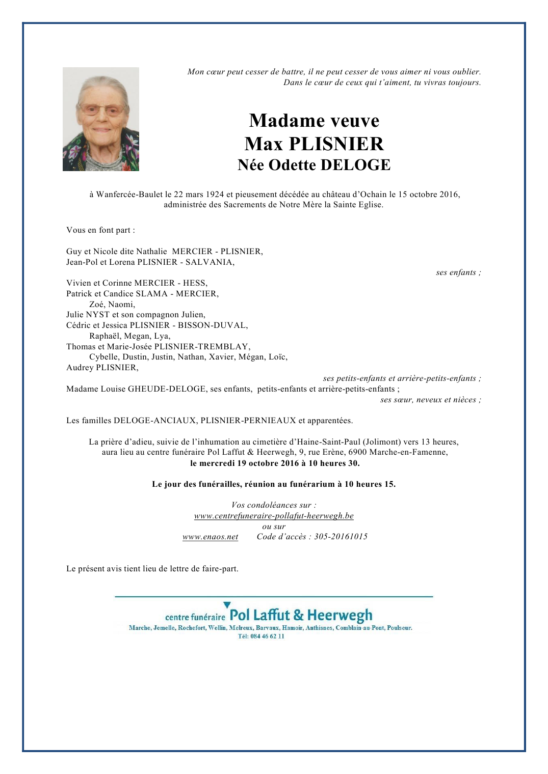 Décédée à Ochain (4560) le samedi 15 octobre 2016 à l'âge de 92 ans