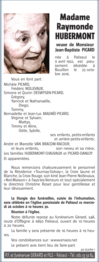 Fallecida en Bouillon (6830) el domingo, 23 de octubre de 2016 a la edad de 94 años