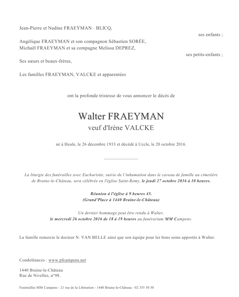 Décédé à Uccle (1180) le jeudi 20 octobre 2016 à l'âge de 82 ans