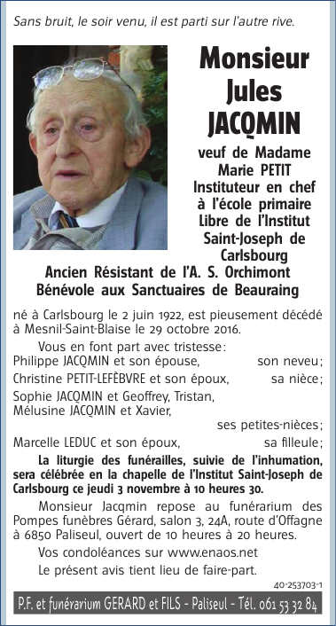 Fallecido en Mesnil-Saint-Blaise (5560) el sábado, 29 de octubre de 2016 a la edad de 94 años