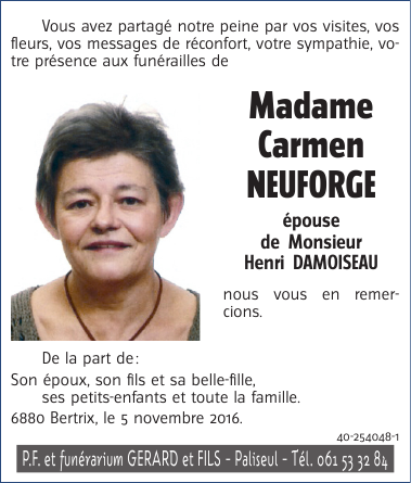 Décédée à Bertrix (6880) le mercredi 19 octobre 2016 à l'âge de 68 ans