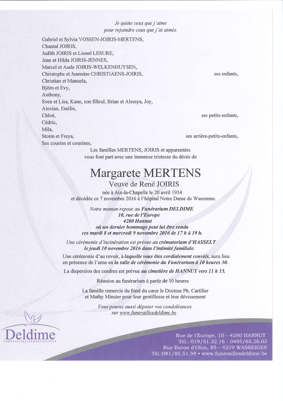 Overleden te Waremme (4300) op maandag 7 november 2016 op 82-jarige leeftijd