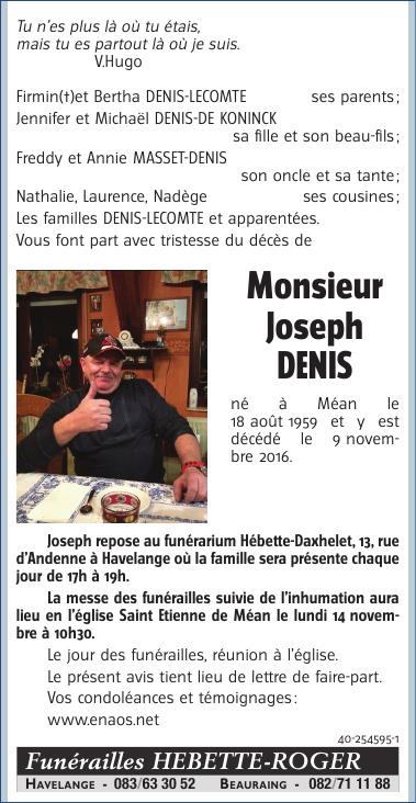 Décédé à Gros-Chêne (5372) le mercredi 9 novembre 2016 à l'âge de 57 ans