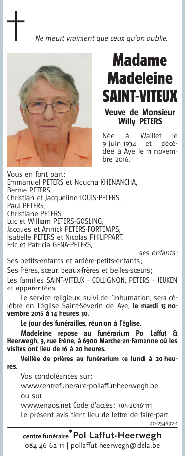 Décédée à Aye (6900) le vendredi 11 novembre 2016 à l'âge de 82 ans