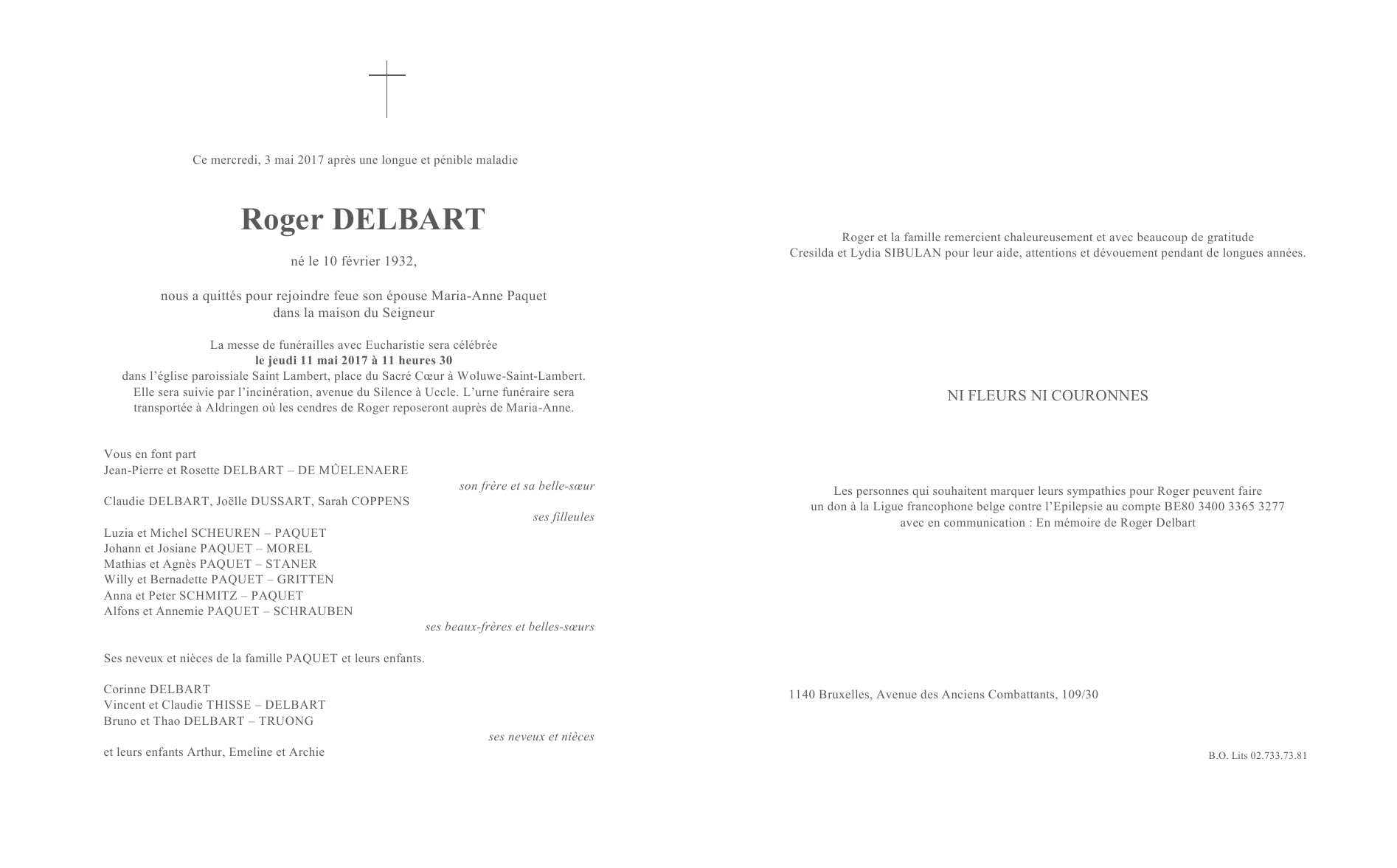 Décédé à Woluwe-Saint-Lambert (1200) le mercredi 3 mai 2017 à l'âge de 85 ans