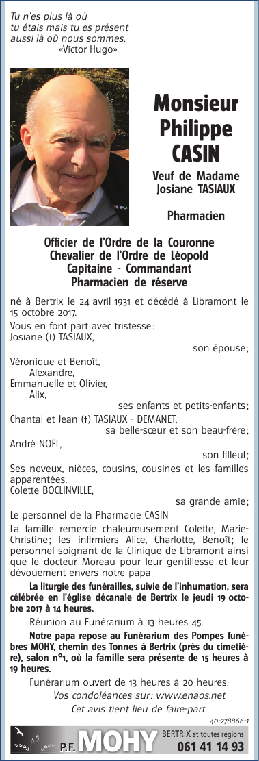 Décédé à Libramont (6800) le dimanche 15 octobre 2017 à l'âge de 86 ans