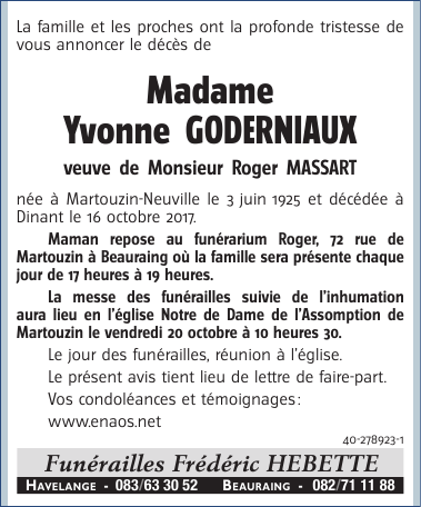 Décédée à Dinant (5500) le lundi 16 octobre 2017 à l'âge de 92 ans