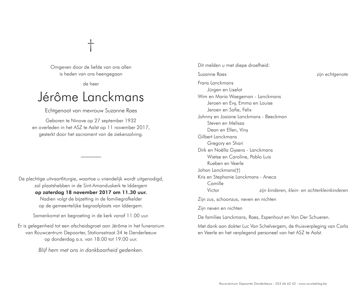 Décédé à Aalst (9300) le samedi 11 novembre 2017 à l'âge de 85 ans